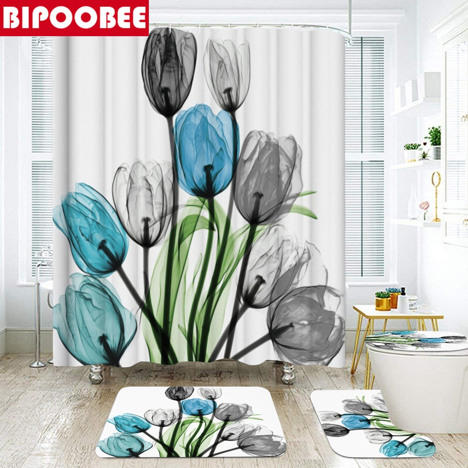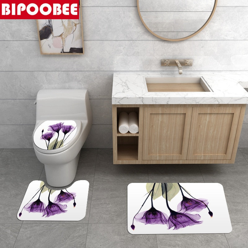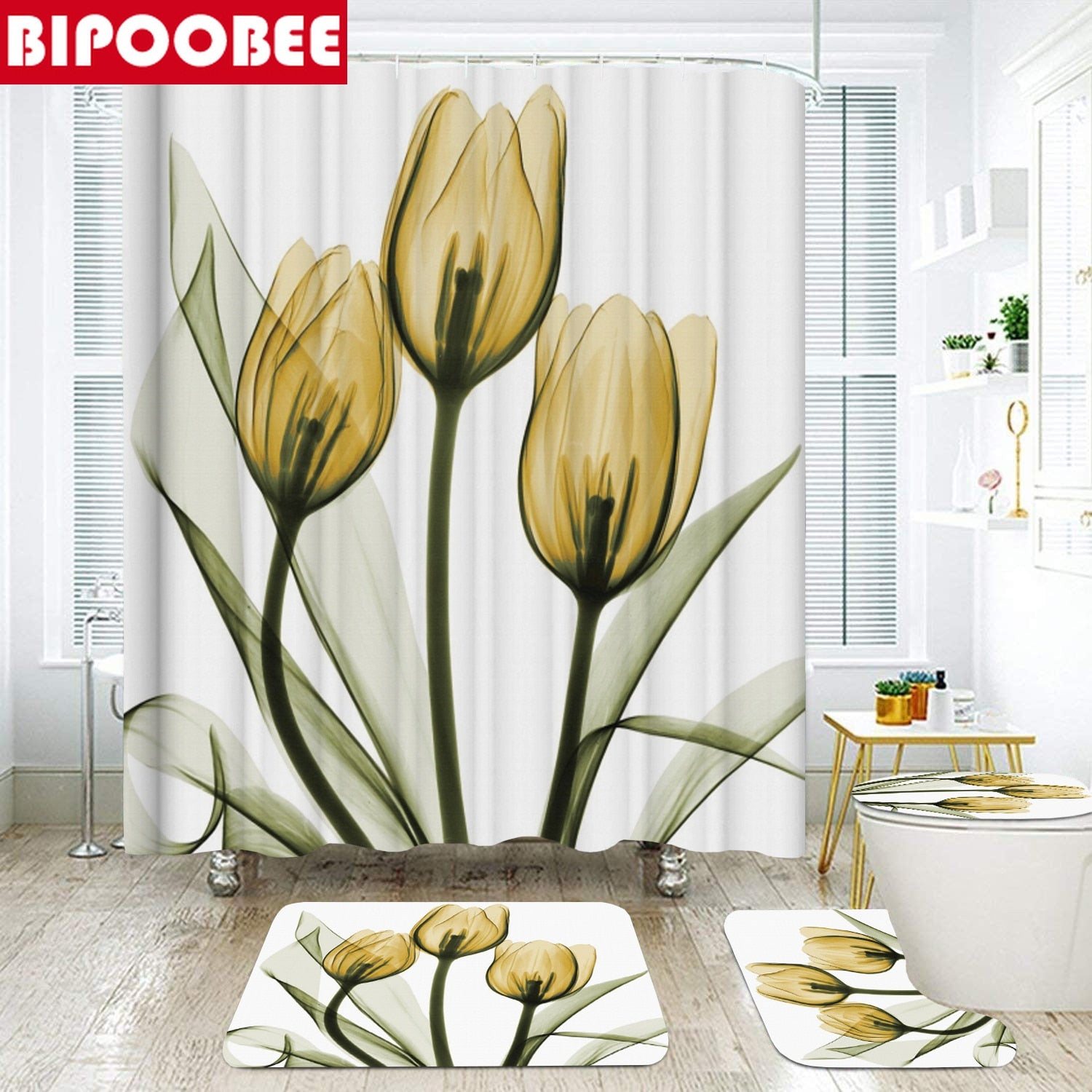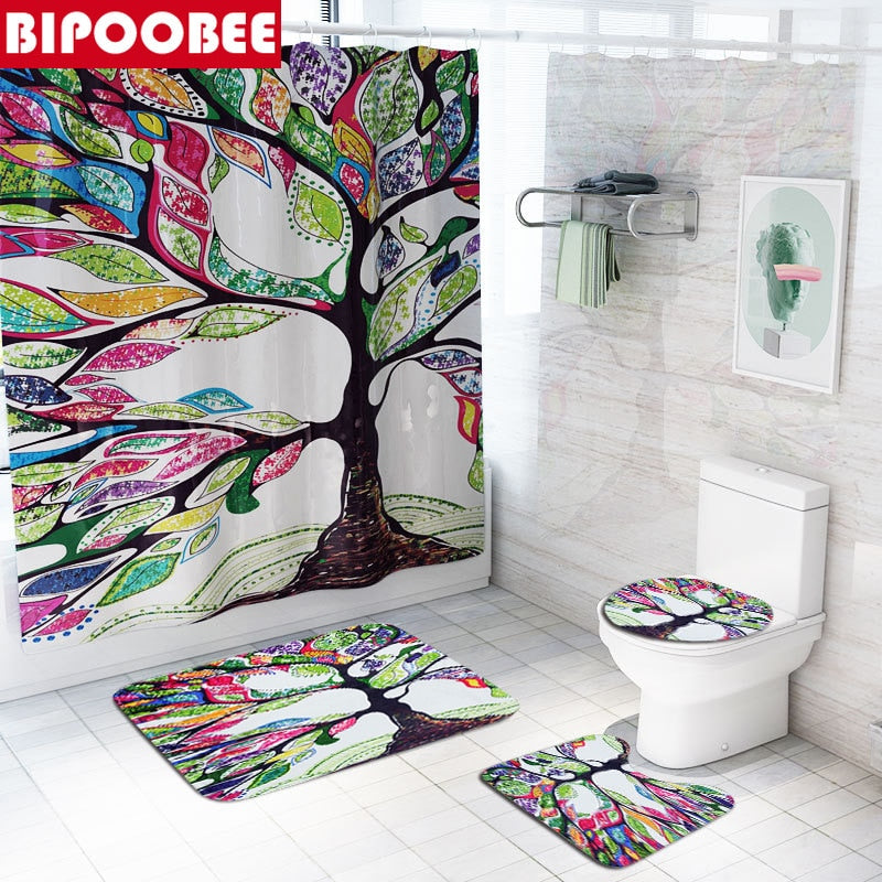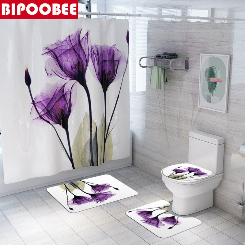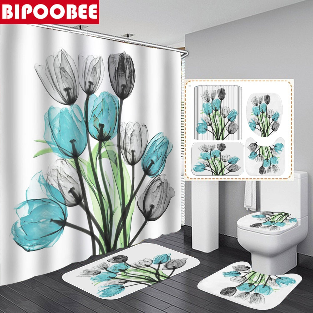 Colorful Tulip Lotus Flowers Trees Shower Curtain Sets Non-Slip Rugs Toilet Lid Cover and Bath Mat Waterproof Bathroom Curtains