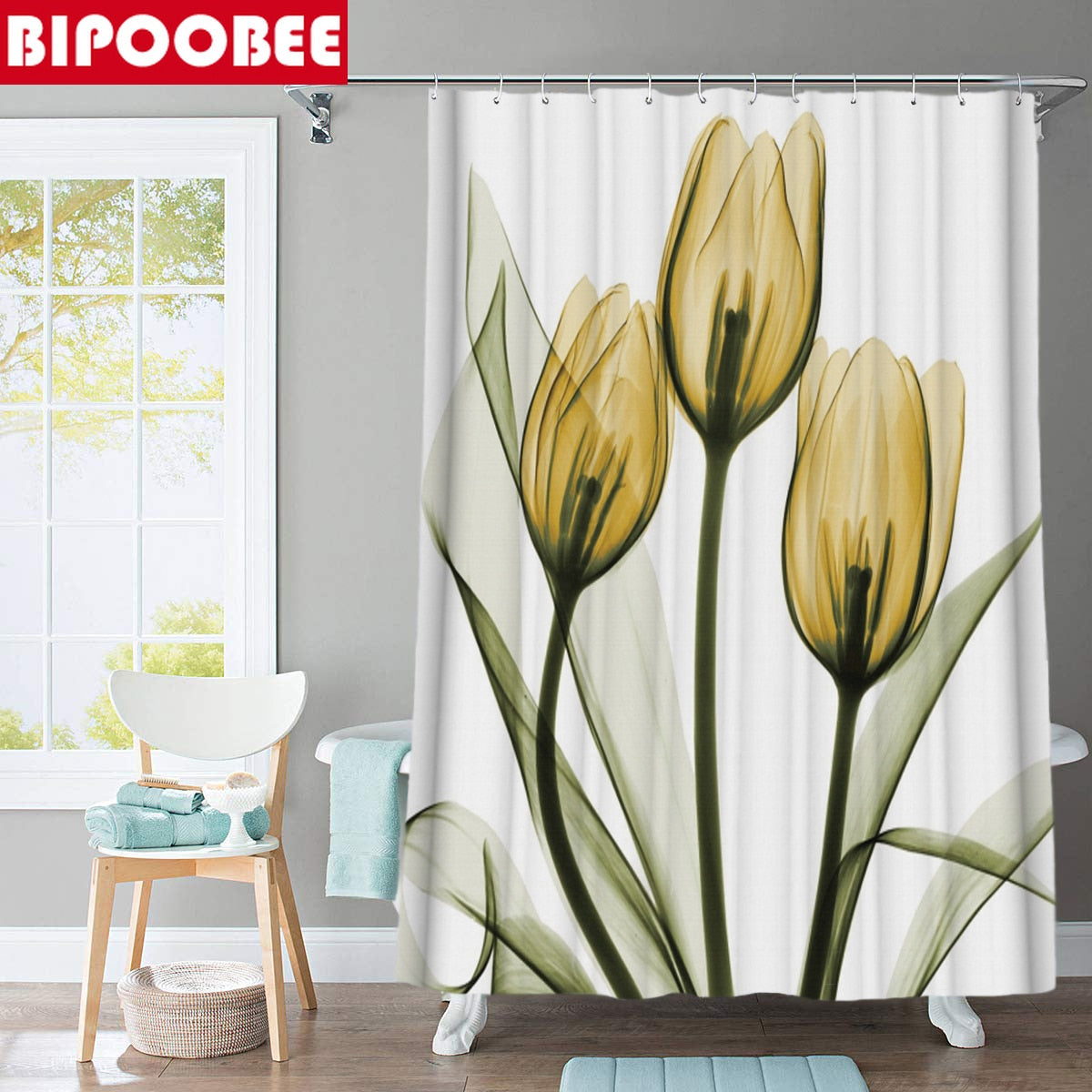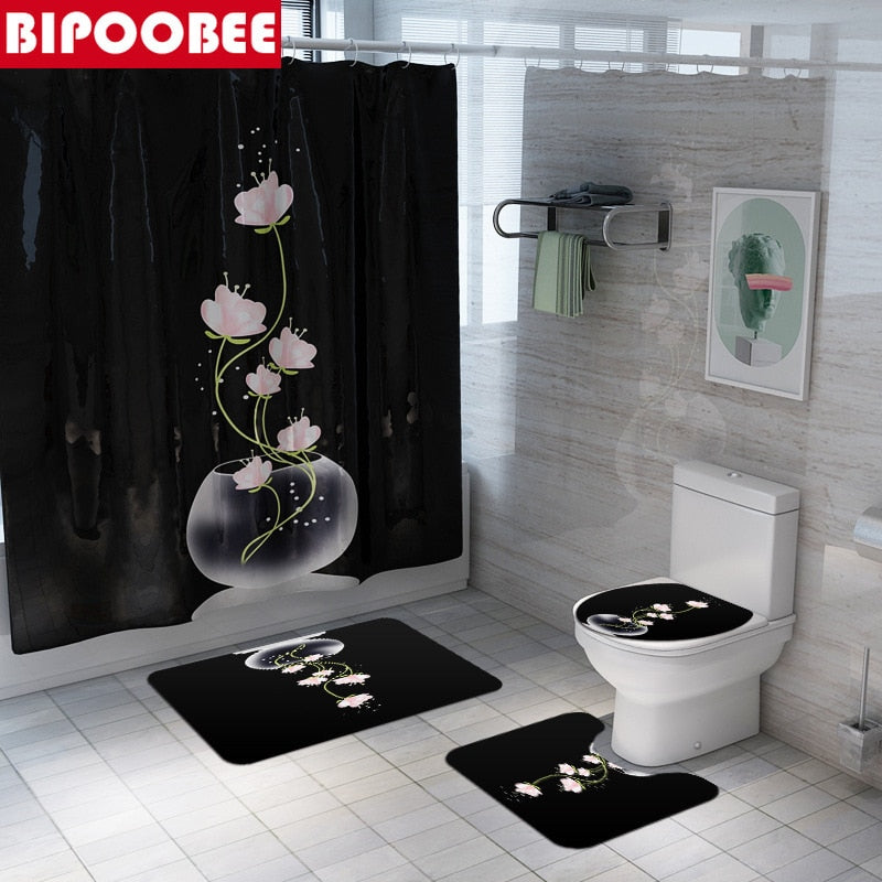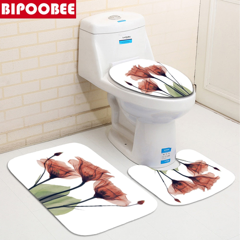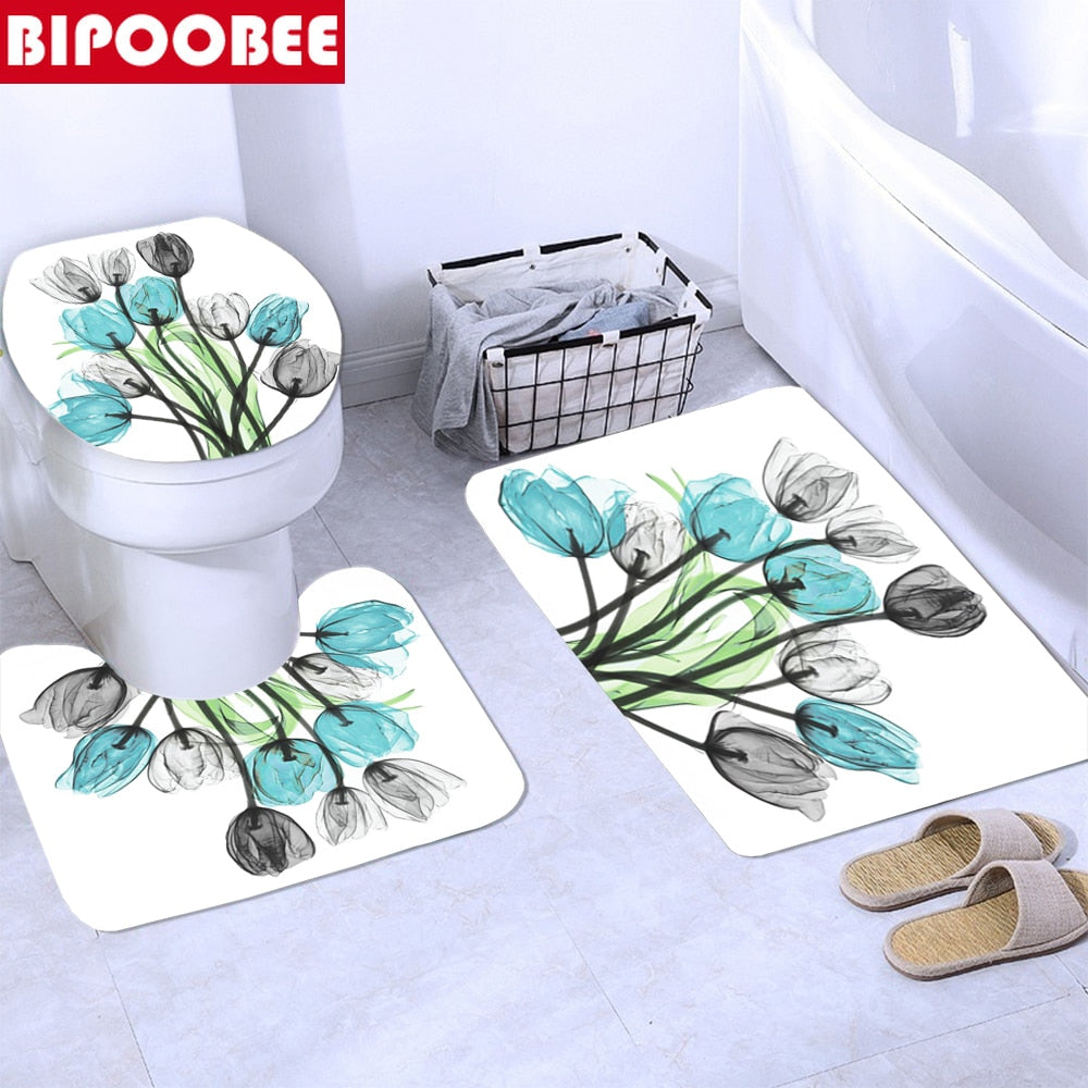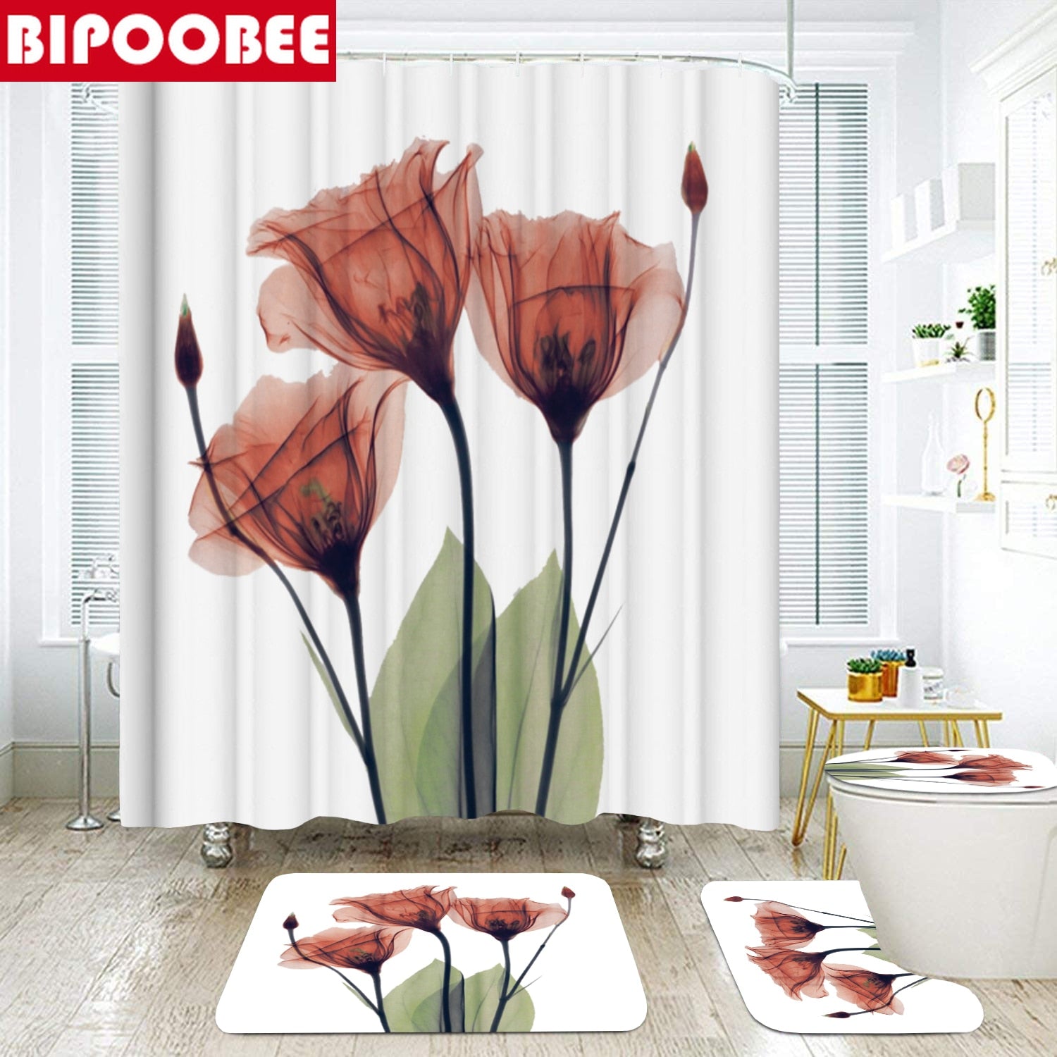 Colorful Tulip Lotus Flowers Trees Shower Curtain Sets Non-Slip Rugs Toilet Lid Cover and Bath Mat Waterproof Bathroom Curtains
