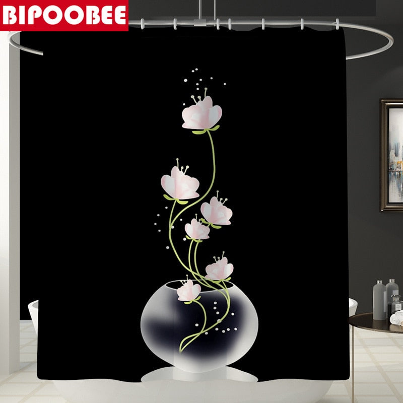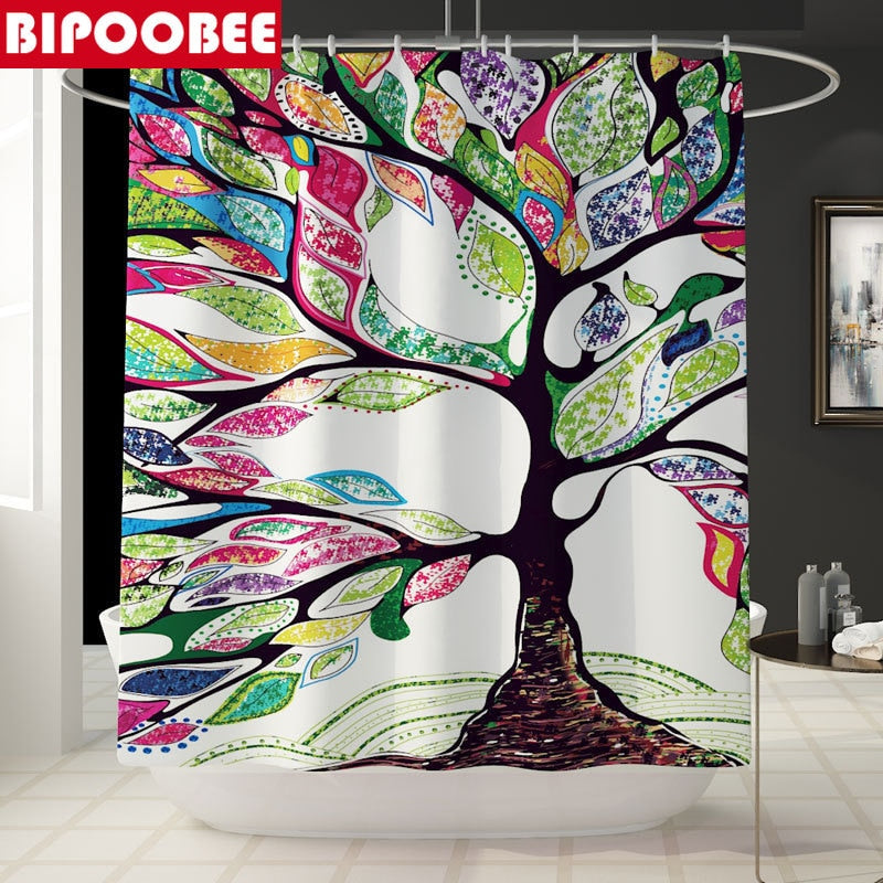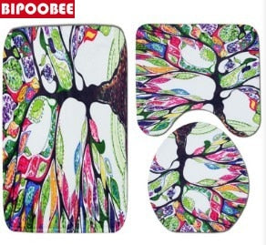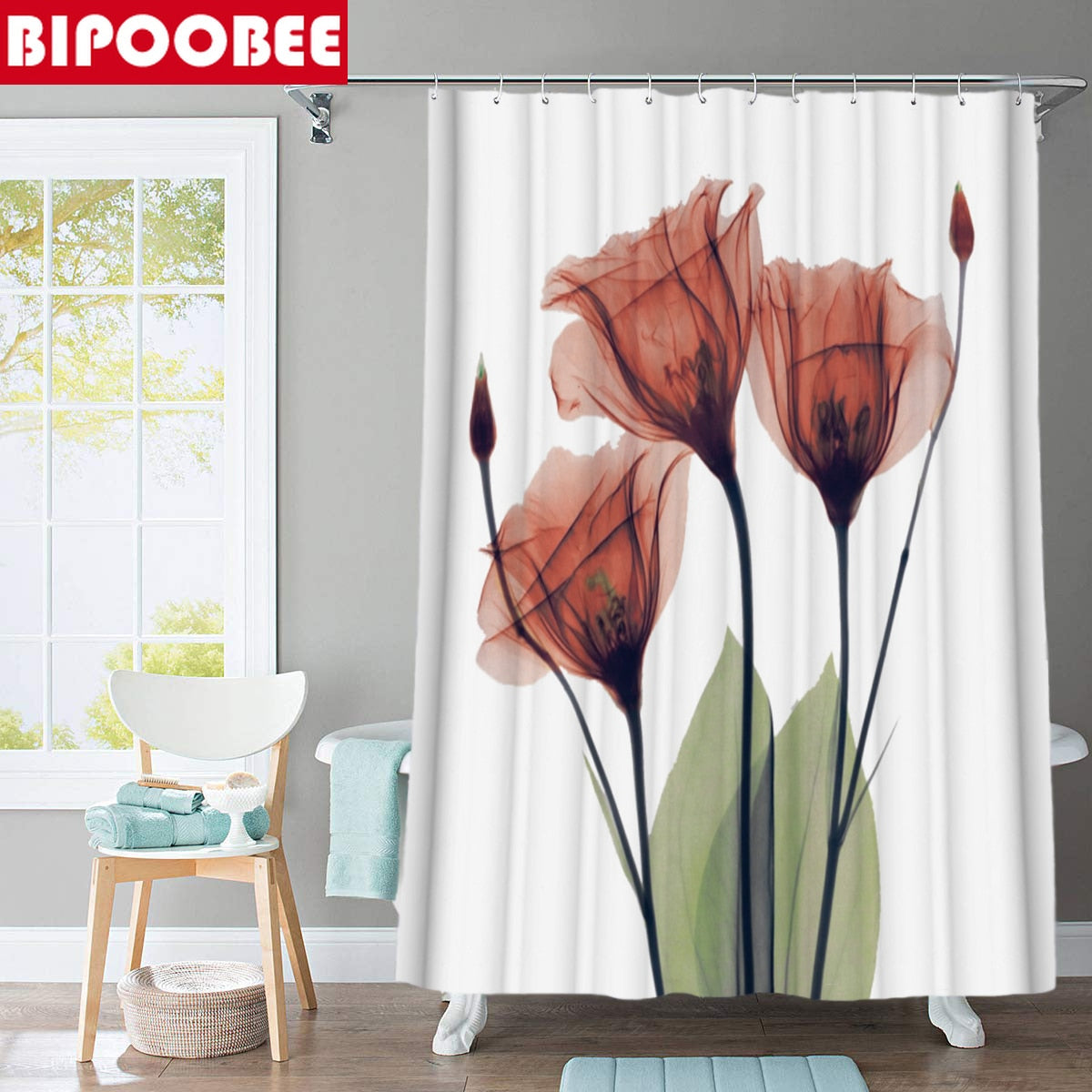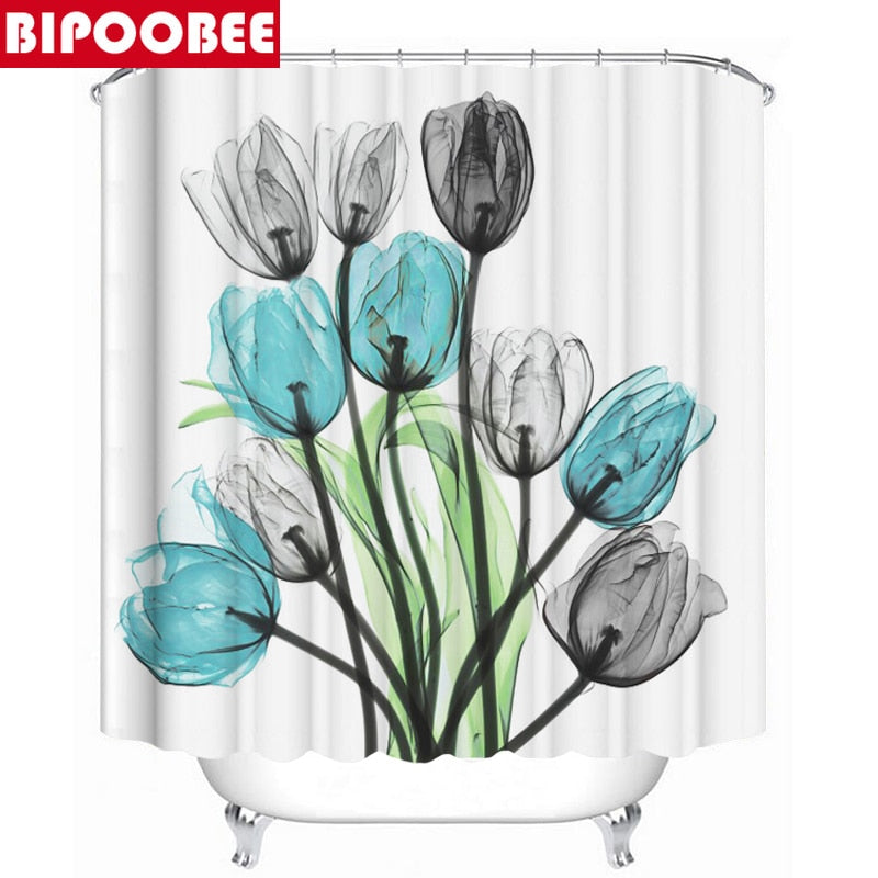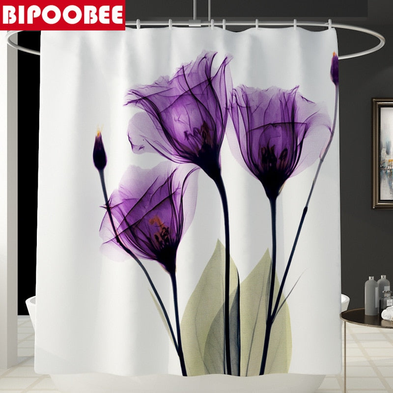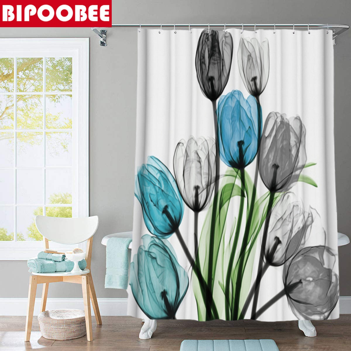Colorful Tulip Lotus Flowers Trees Shower Curtain Sets Non-Slip Rugs Toilet Lid Cover and Bath Mat Waterproof Bathroom Curtains