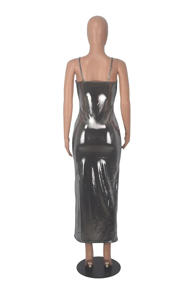 Shiny Bodycon Slim Sexy Ankle Length Long Dress Spaghetti Strap Glitter Metallic Midi Party/Club Dress