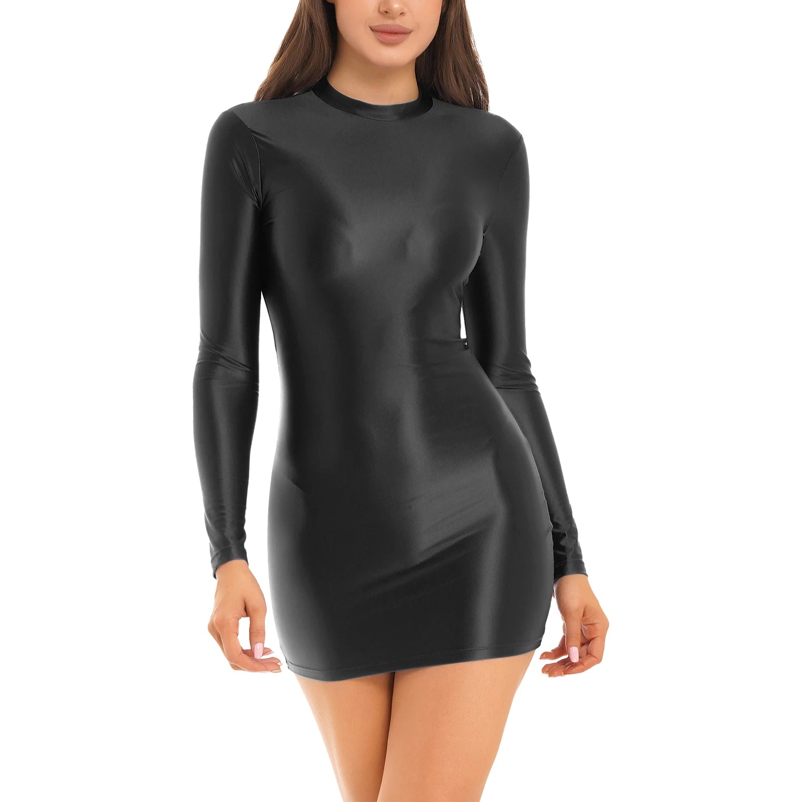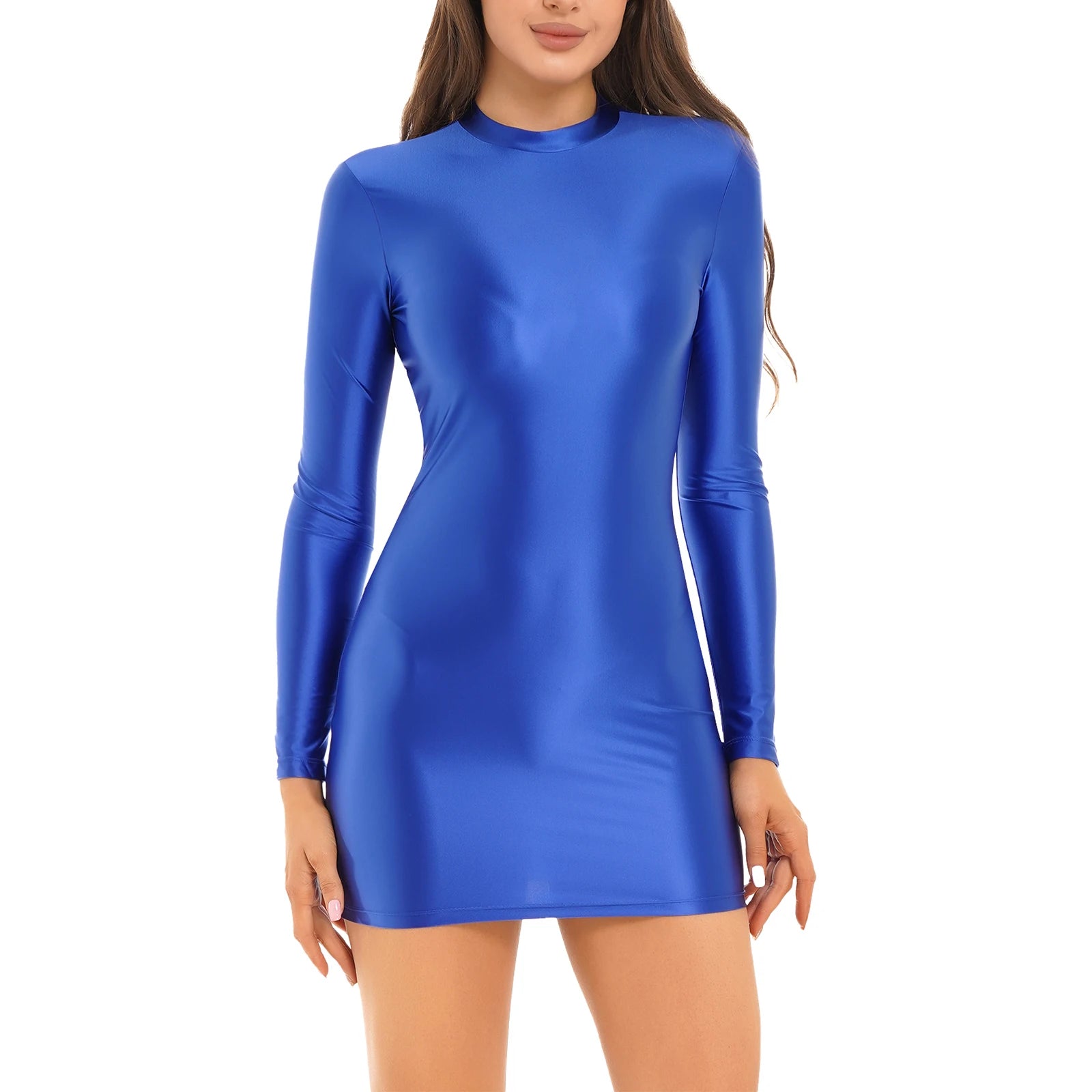 Bodycon Dress Smooth Stretchy Tight Party Dress Glossy Long Sleeve Dress Clubwear