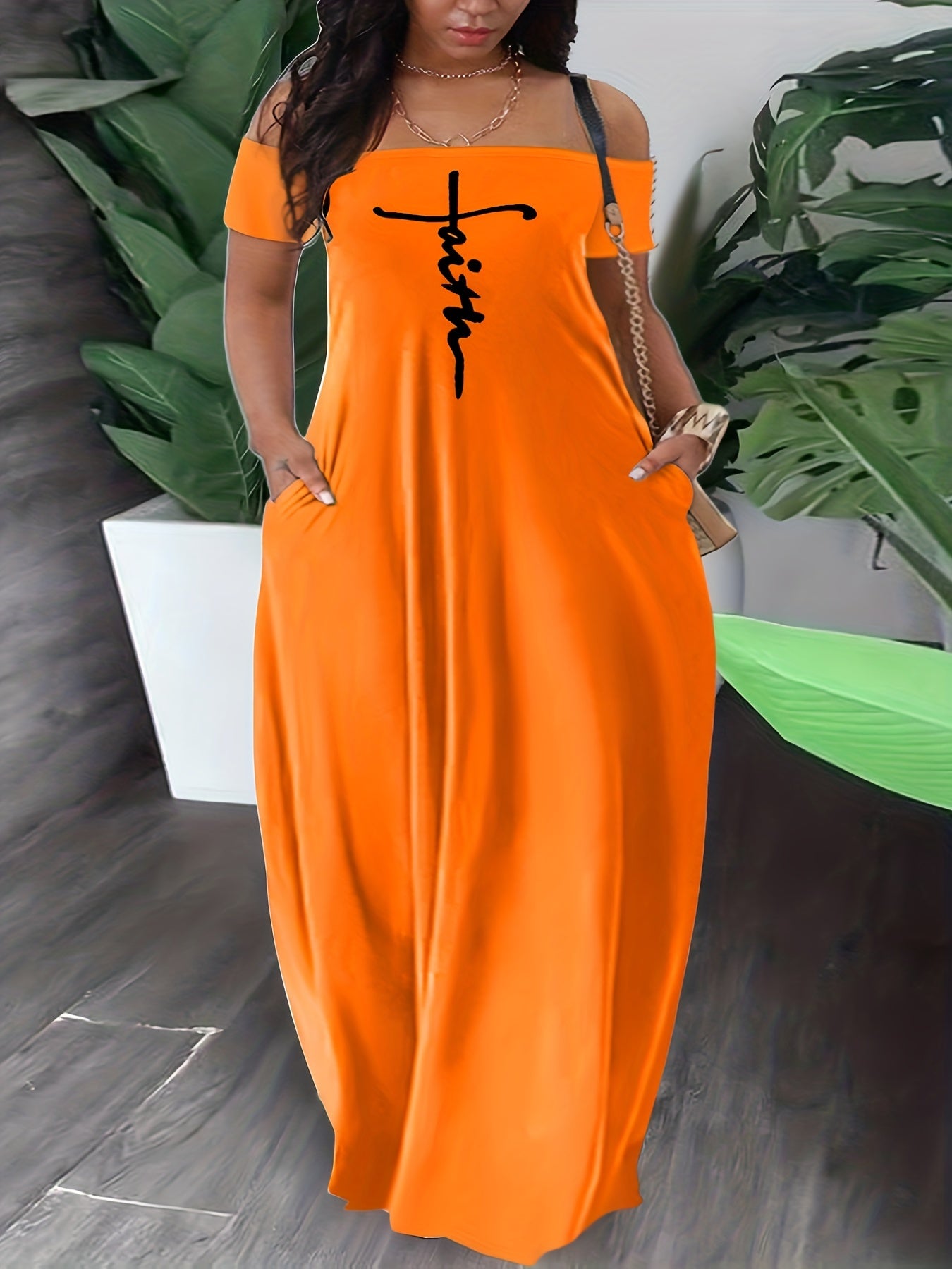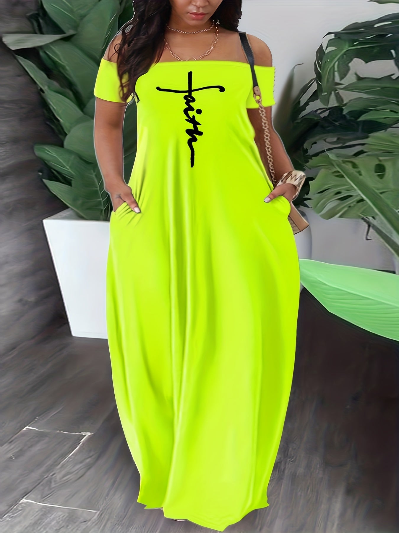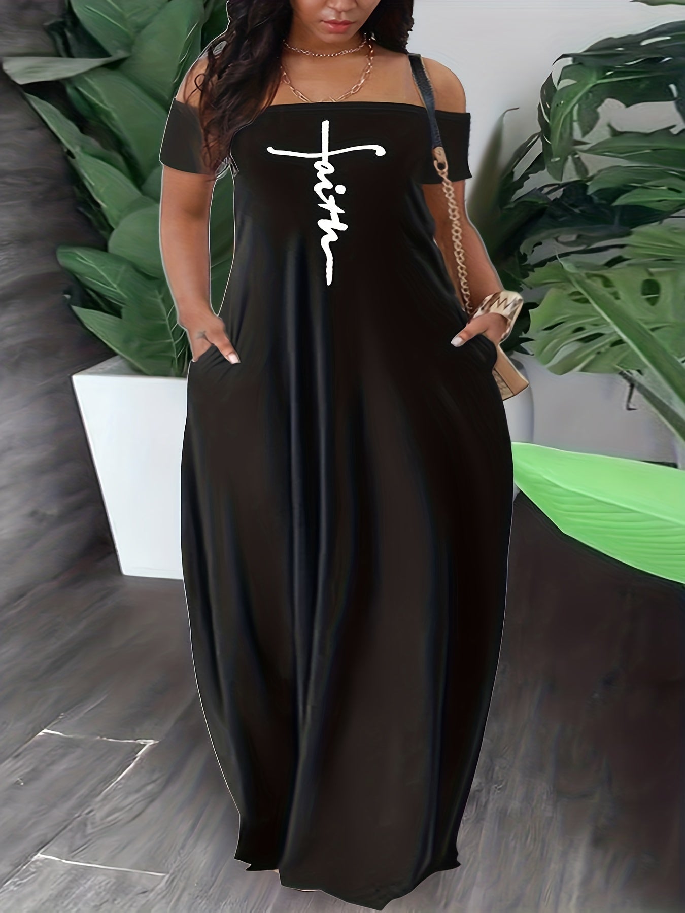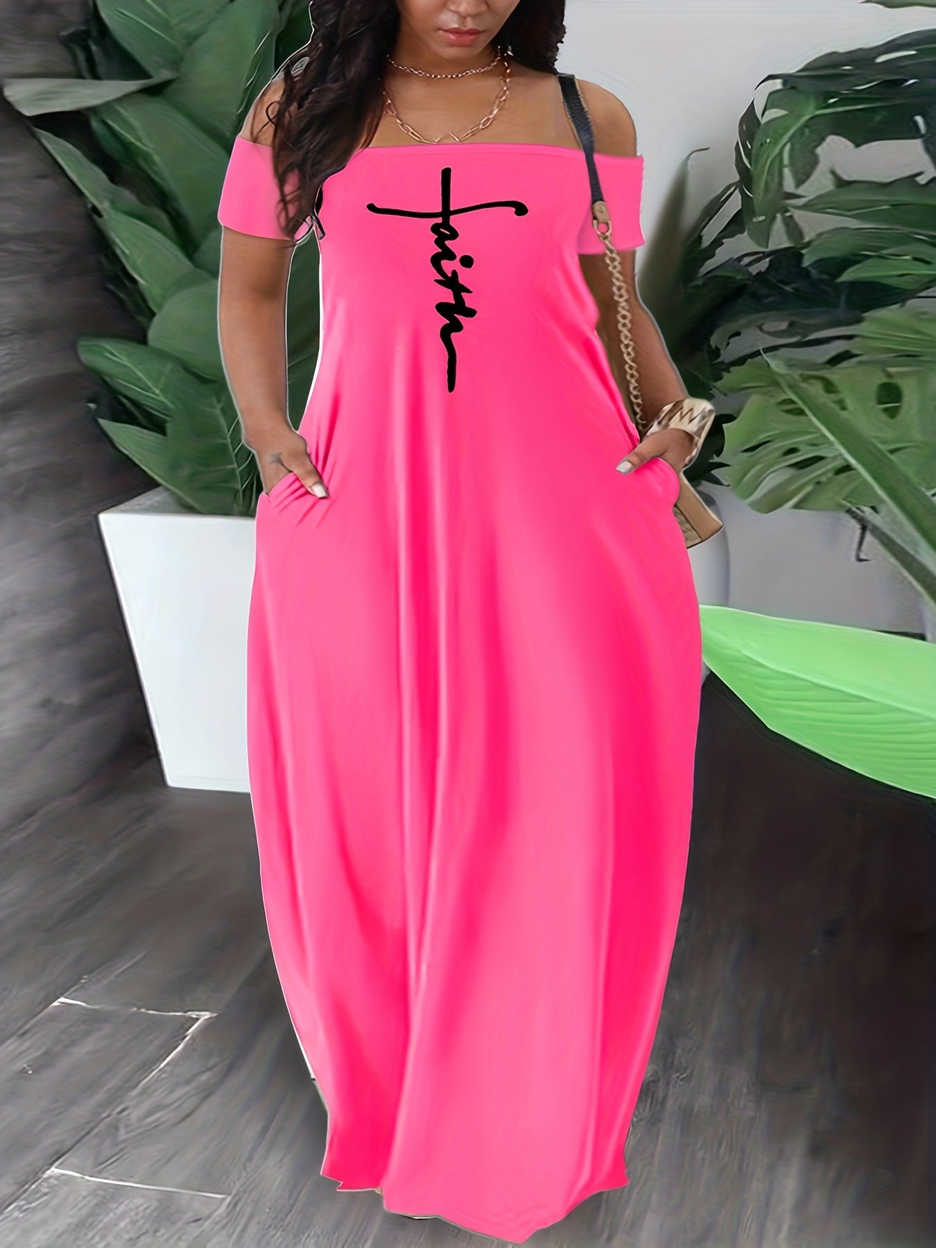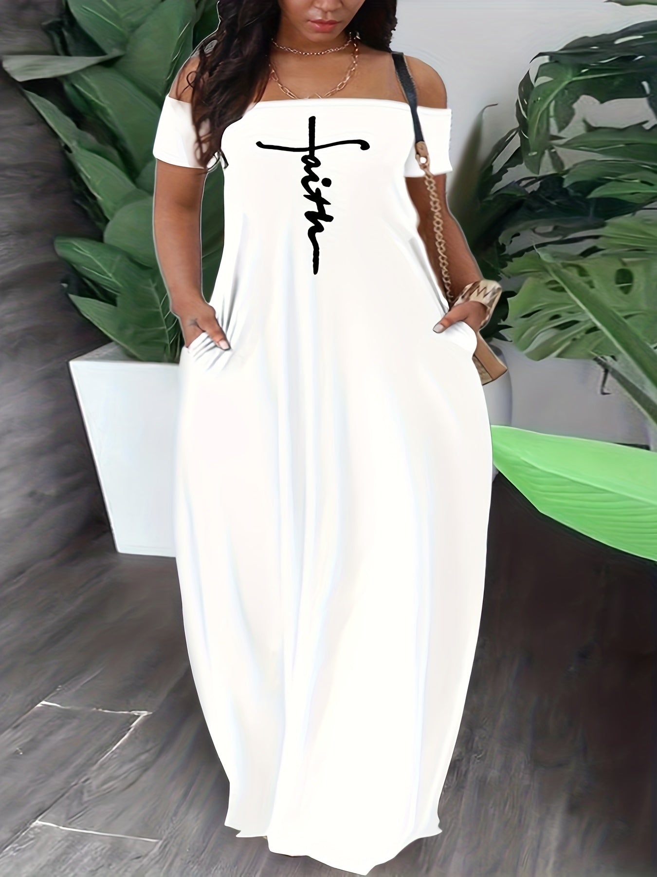 Casual Dress Cross Letter Print Off Shoulder Short Sleeve Maxi Dress With Pockets